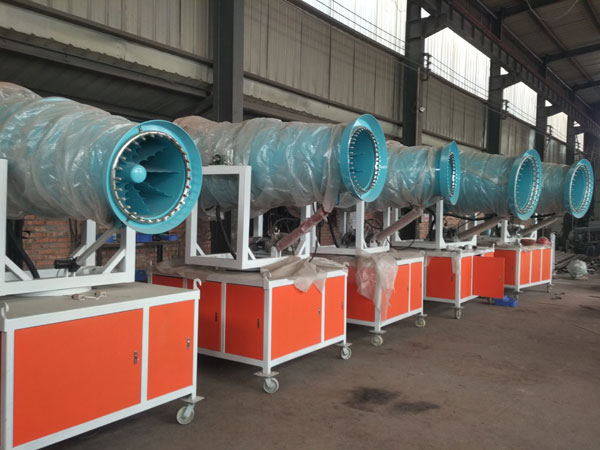 除尘雾炮机当风机旋转时,在喷雾机的出风管内产生高速气流,把喷头喷出的雾化水雾通过高压气流将雾滴进一步雾化成更细小的雾滴后吹向靶标。除尘雾炮机的喷雾量由调量阀进行控制,除尘雾炮机喷出的雾滴大小可以通过改变水泵压力来进行调整,除尘雾炮机的喷射方向可以通过改变出风管的位置来进行调节(自动型除尘雾炮机可以